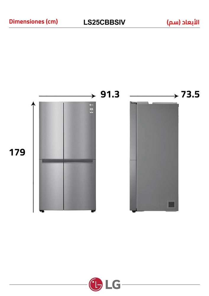 - ثلاجة دولابي ال جي 2 باب سعة الثلاجة 14.6 قدم سعة المجمد 8.2 قدم انفرتر فضي غامق