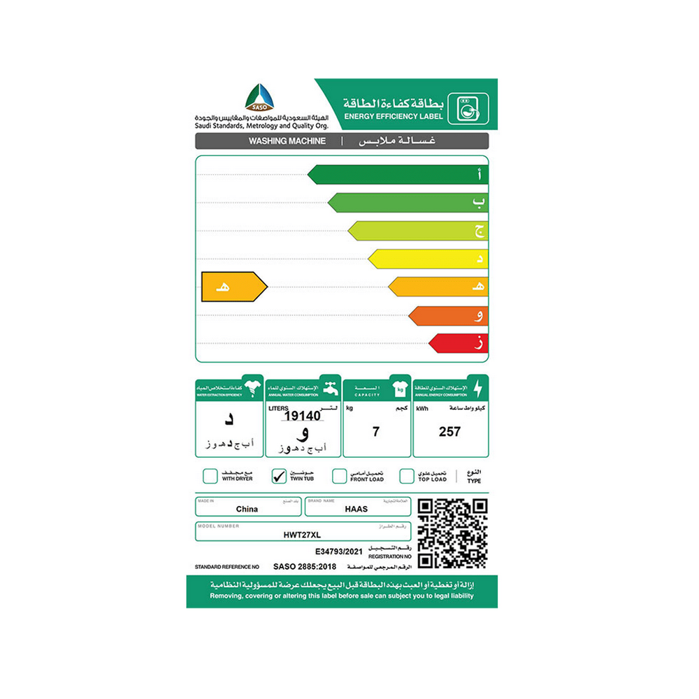 غسالة حوضين هاس 7 كيلو ابيض