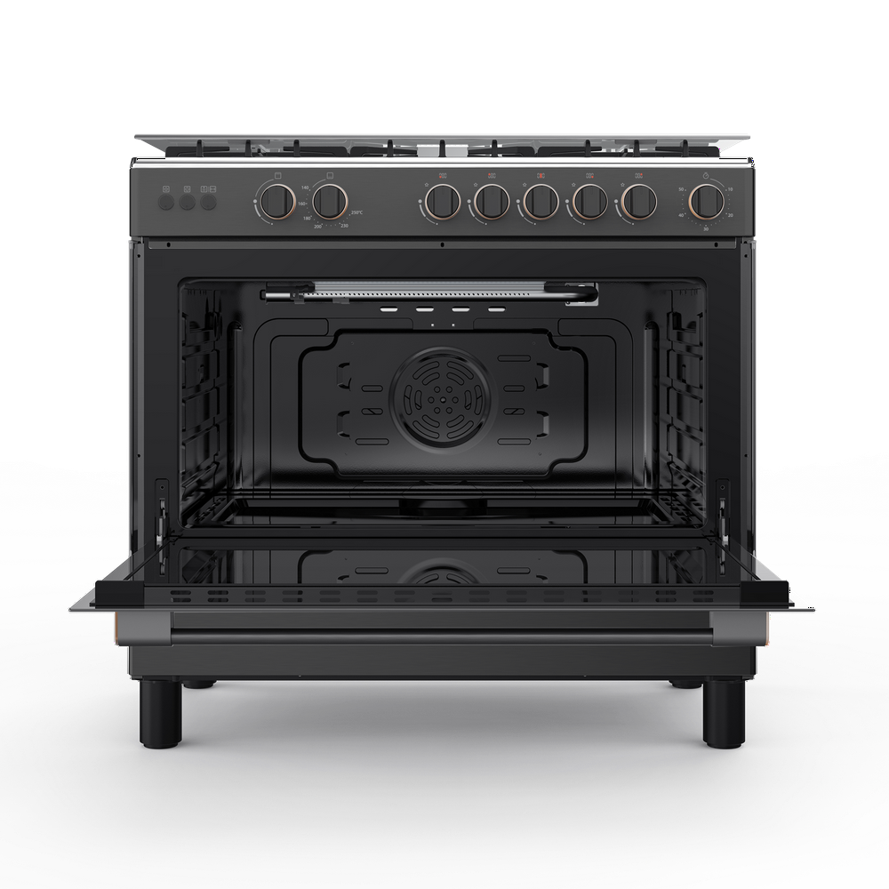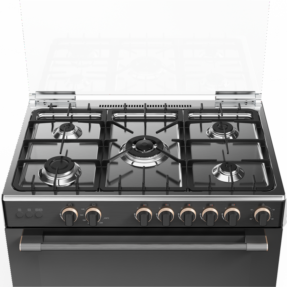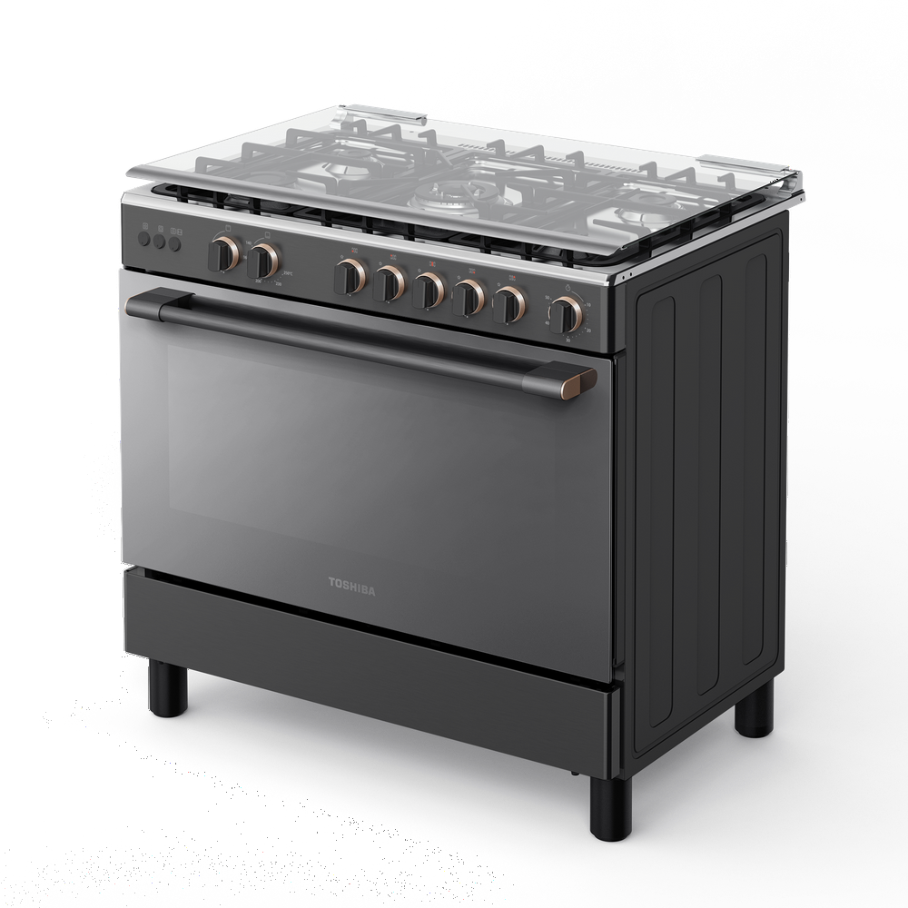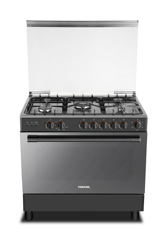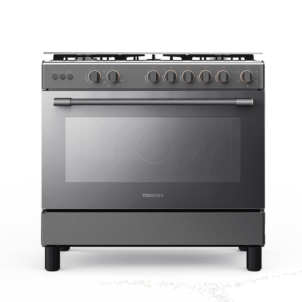 فرن غاز توشيبا 5 عيون 90 سم مع مروحة شبك عريض سطح استيل جانب سلفر
