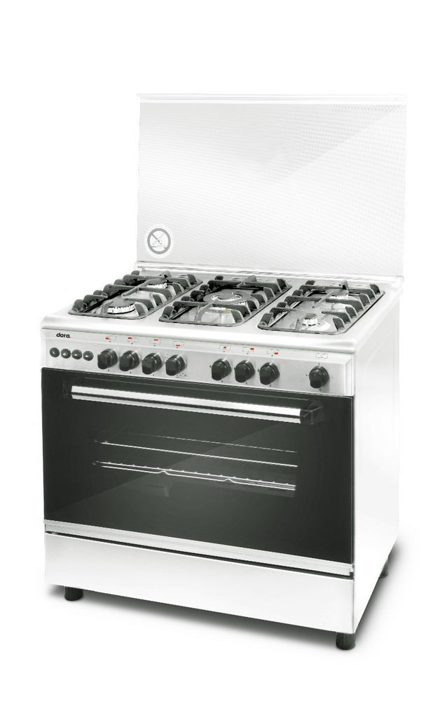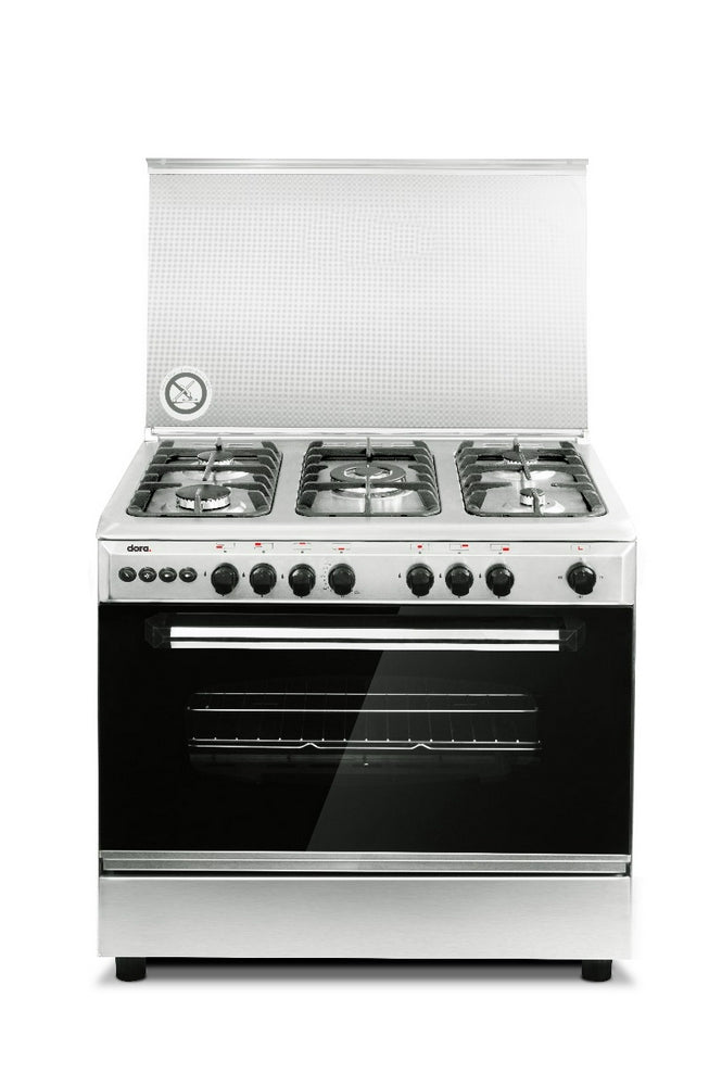 فرن غاز دورا 5 عيون 90×60 امان كامل سطح استيل جوانب سلفر مع مروحة (شبك عريض)